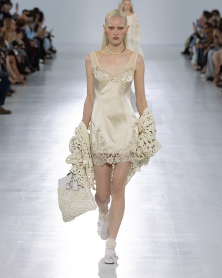 Completi e abiti con stampe a pois, dettagli in pizzo, look in seta e vaporose gonne in tulle sfilano alla Milano Fashion Week sulla passerella Primavera/Estate 2026 di Ermanno Scervino.