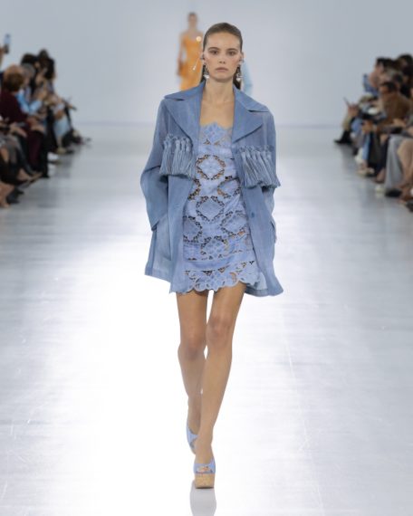 Completi e abiti con stampe a pois, dettagli in pizzo, look in seta e vaporose gonne in tulle sfilano alla Milano Fashion Week sulla passerella Primavera/Estate 2026 di Ermanno Scervino.