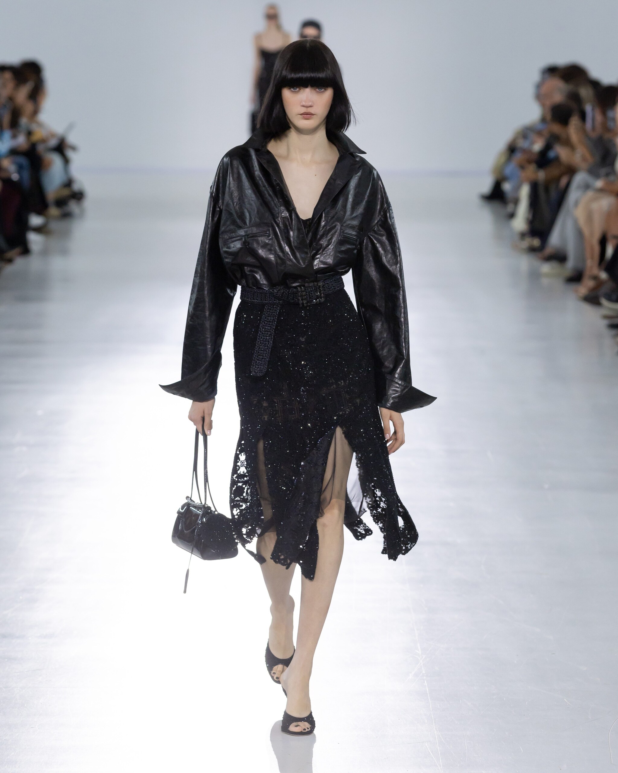 Completi e abiti con stampe a pois, dettagli in pizzo, look in seta e vaporose gonne in tulle sfilano alla Milano Fashion Week sulla passerella Primavera/Estate 2026 di Ermanno Scervino.