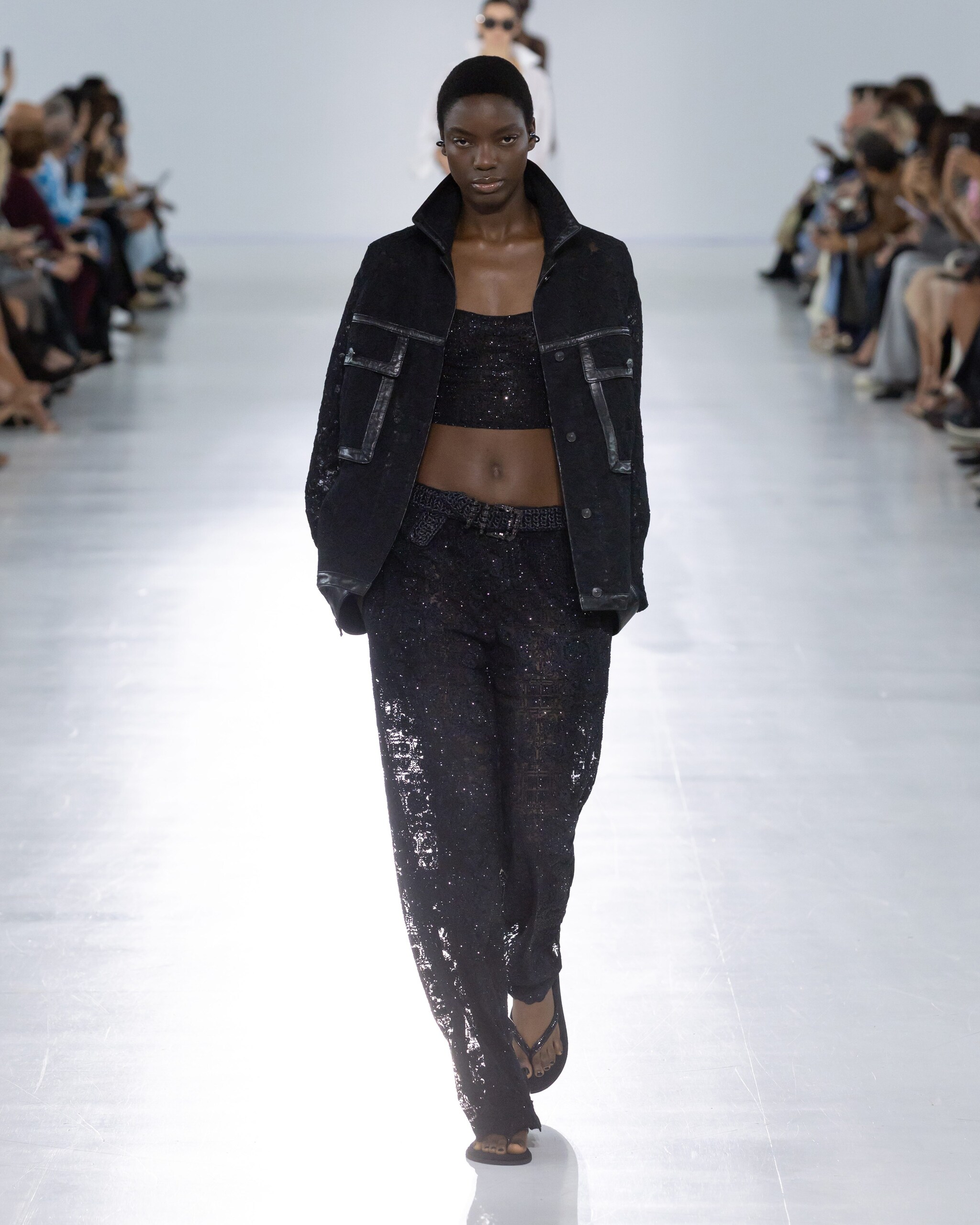 Completi e abiti con stampe a pois, dettagli in pizzo, look in seta e vaporose gonne in tulle sfilano alla Milano Fashion Week sulla passerella Primavera/Estate 2026 di Ermanno Scervino.