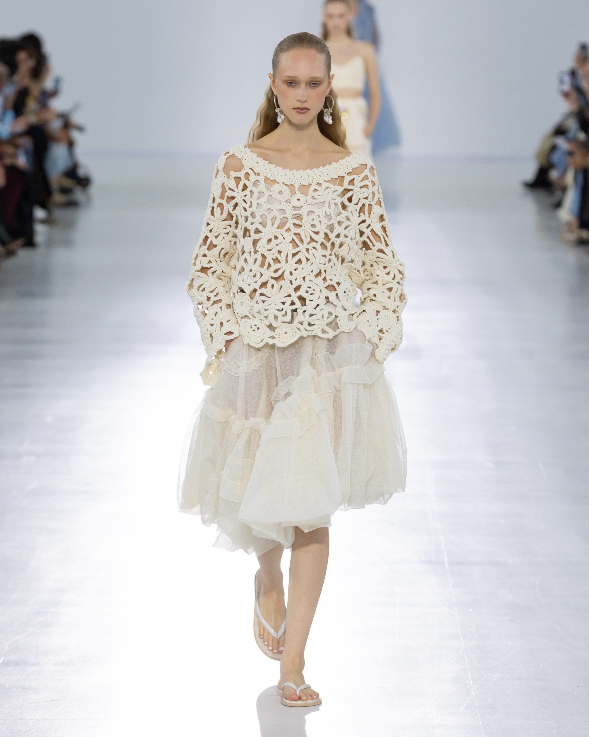 Completi e abiti con stampe a pois, dettagli in pizzo, look in seta e vaporose gonne in tulle sfilano alla Milano Fashion Week sulla passerella Primavera/Estate 2026 di Ermanno Scervino.