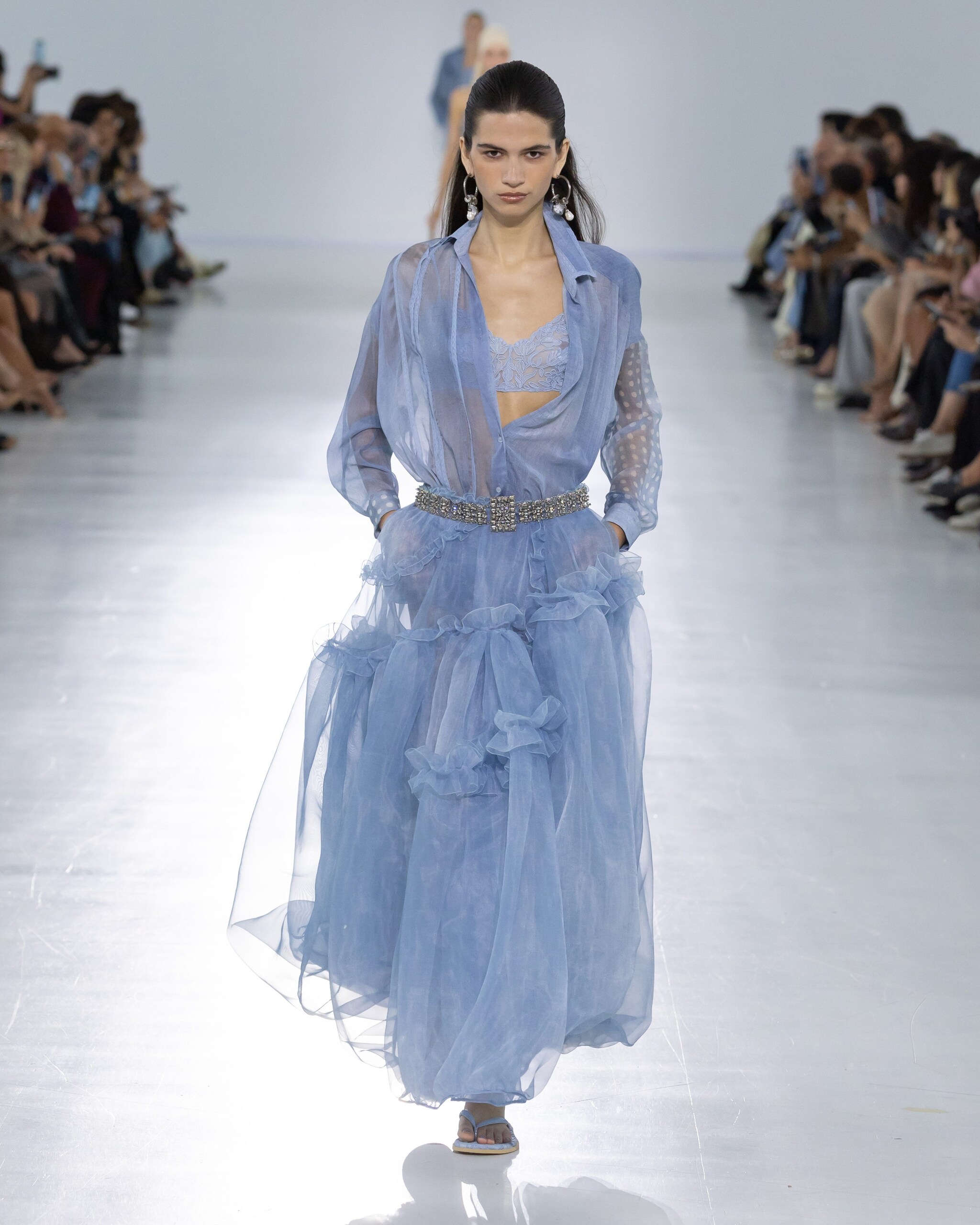 Completi e abiti con stampe a pois, dettagli in pizzo, look in seta e vaporose gonne in tulle sfilano alla Milano Fashion Week sulla passerella Primavera/Estate 2026 di Ermanno Scervino.
