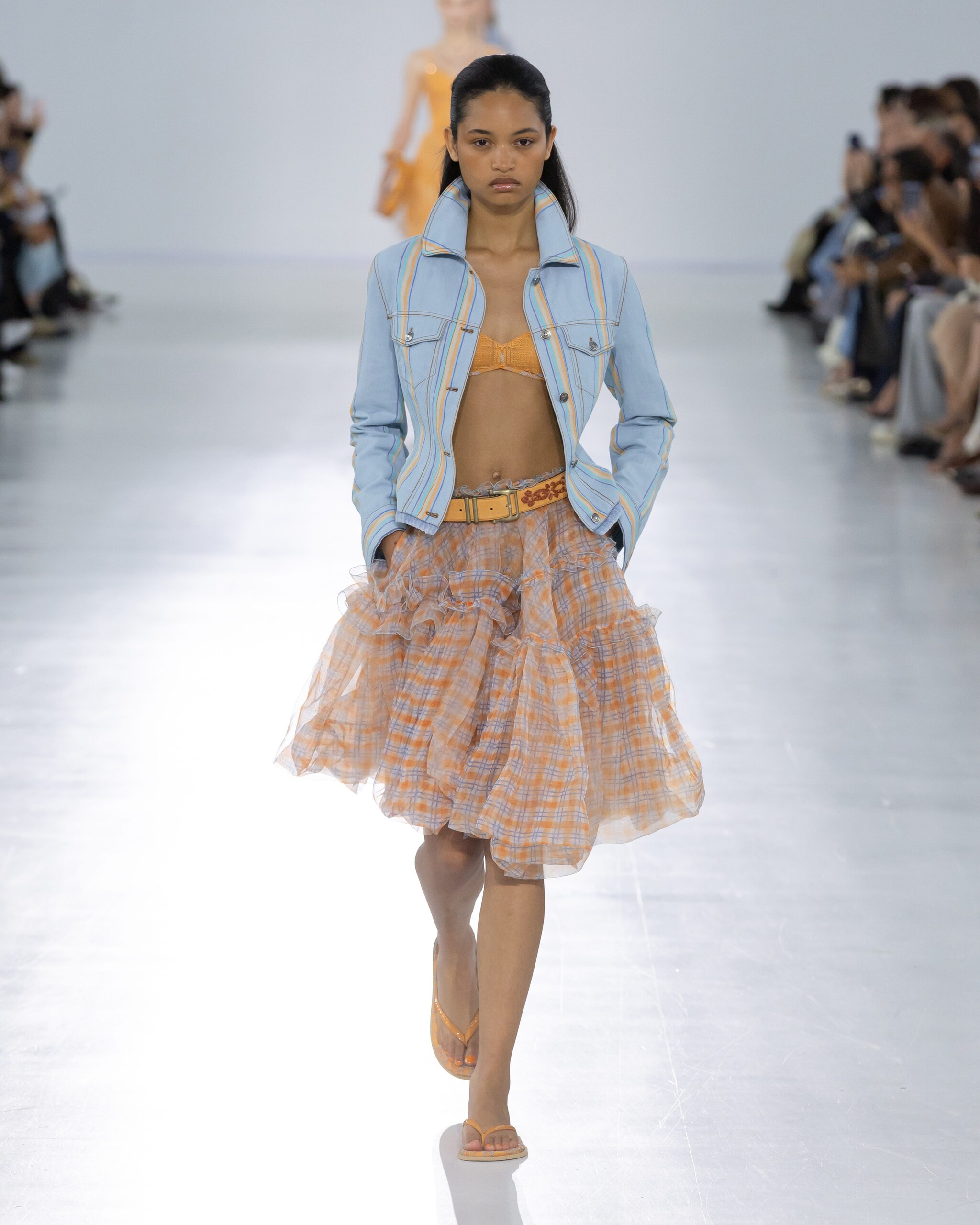 Completi e abiti con stampe a pois, dettagli in pizzo, look in seta e vaporose gonne in tulle sfilano alla Milano Fashion Week sulla passerella Primavera/Estate 2026 di Ermanno Scervino.