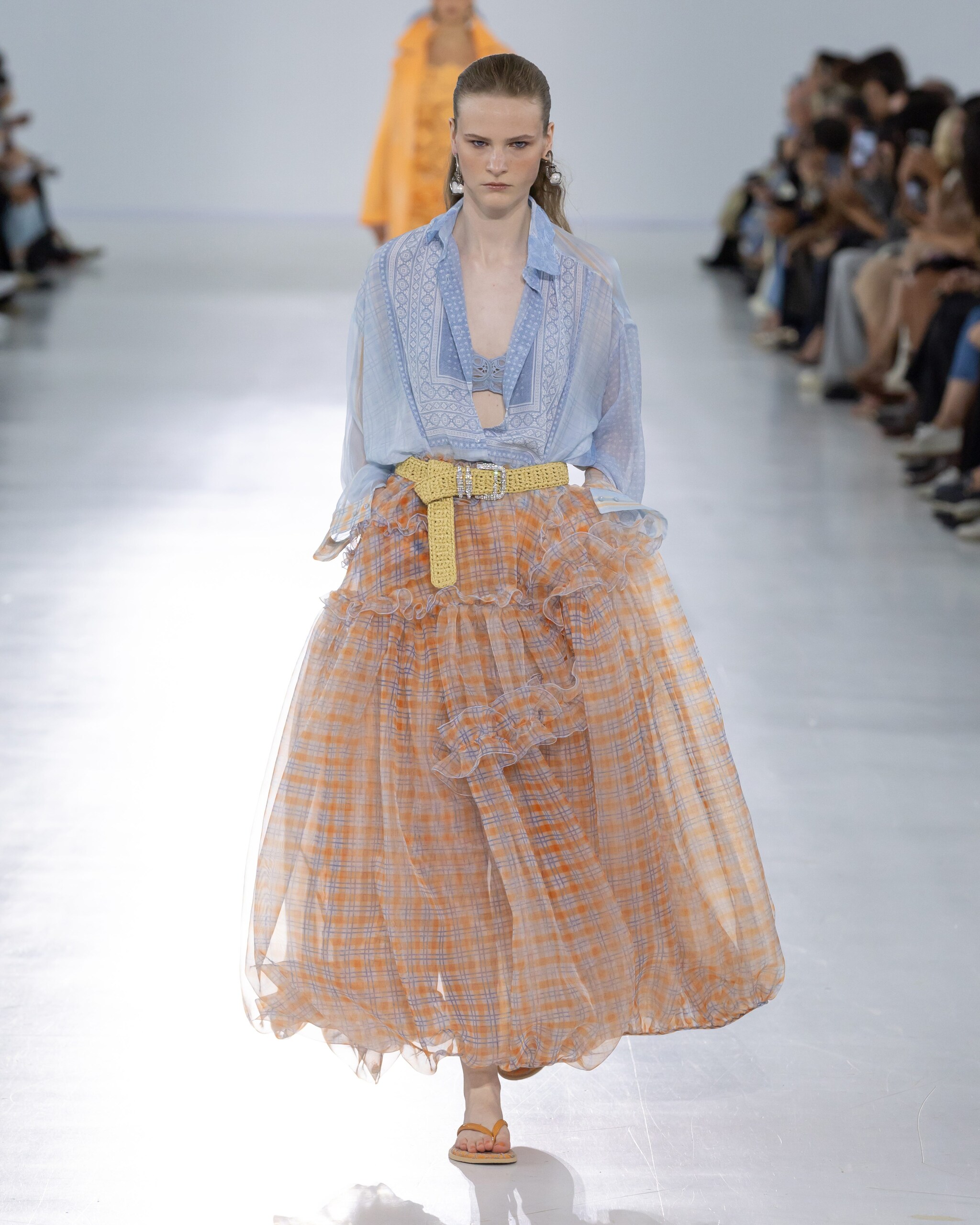 Completi e abiti con stampe a pois, dettagli in pizzo, look in seta e vaporose gonne in tulle sfilano alla Milano Fashion Week sulla passerella Primavera/Estate 2026 di Ermanno Scervino.