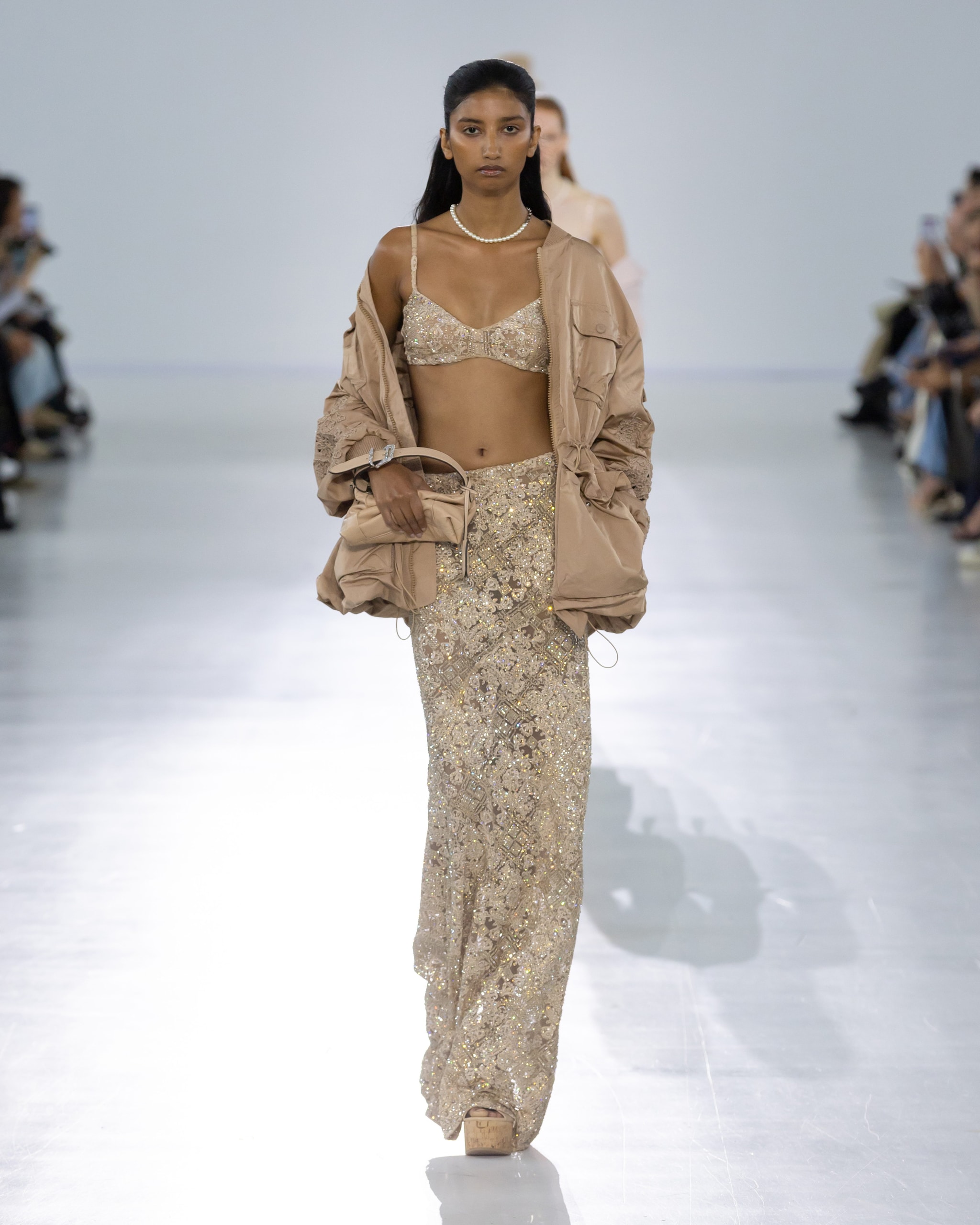 Completi e abiti con stampe a pois, dettagli in pizzo, look in seta e vaporose gonne in tulle sfilano alla Milano Fashion Week sulla passerella Primavera/Estate 2026 di Ermanno Scervino.