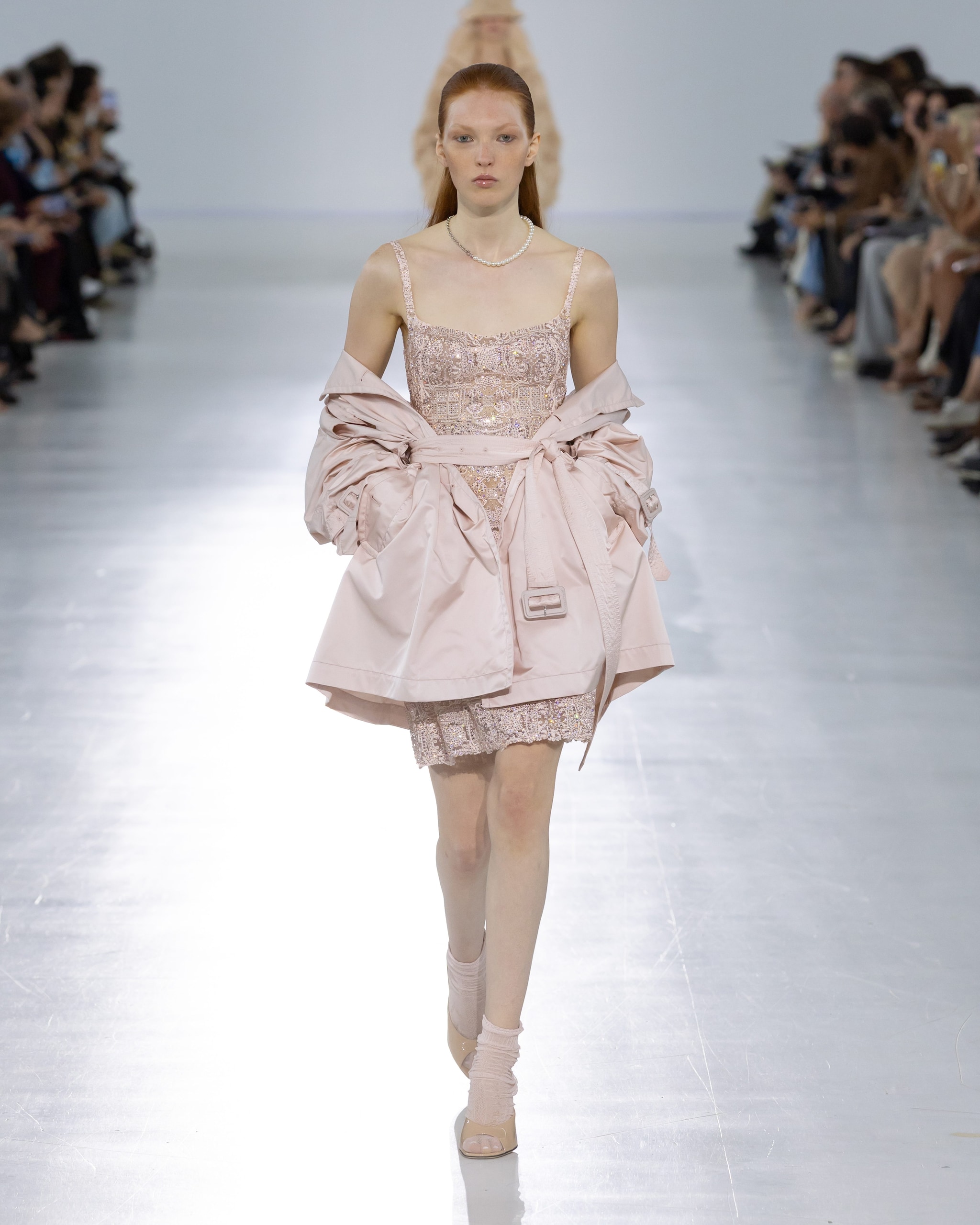 Completi e abiti con stampe a pois, dettagli in pizzo, look in seta e vaporose gonne in tulle sfilano alla Milano Fashion Week sulla passerella Primavera/Estate 2026 di Ermanno Scervino.