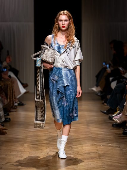 Capi in denim rivisitato, stampe foulard su capi in seta, abiti drappeggiati e lunghe frange sfilano alla Milano Fashion Week sulla passerella Primavera/Estate 2026 di Pierre-Louis Mascia,
