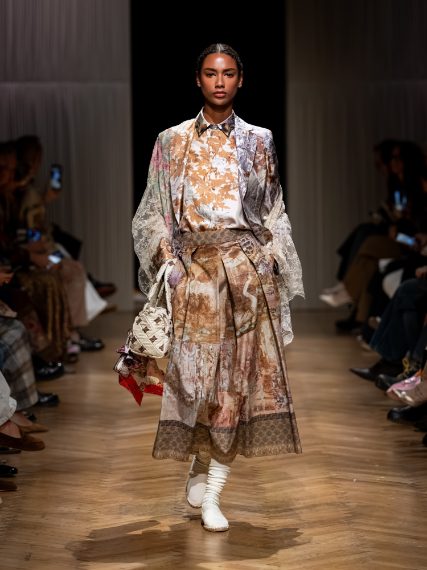 Capi in denim rivisitato, stampe foulard su capi in seta, abiti drappeggiati e lunghe frange sfilano alla Milano Fashion Week sulla passerella Primavera/Estate 2026 di Pierre-Louis Mascia,