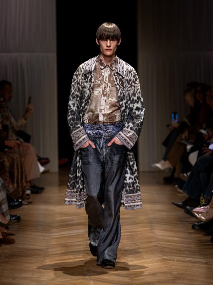 Capi in denim rivisitato, stampe foulard su capi in seta, abiti drappeggiati e lunghe frange sfilano alla Milano Fashion Week sulla passerella Primavera/Estate 2026 di Pierre-Louis Mascia,