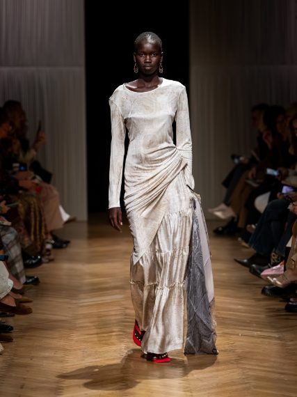 Capi in denim rivisitato, stampe foulard su capi in seta, abiti drappeggiati e lunghe frange sfilano alla Milano Fashion Week sulla passerella Primavera/Estate 2026 di Pierre-Louis Mascia,