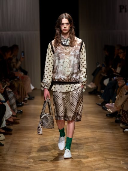 Capi in denim rivisitato, stampe foulard su capi in seta, abiti drappeggiati e lunghe frange sfilano alla Milano Fashion Week sulla passerella Primavera/Estate 2026 di Pierre-Louis Mascia,