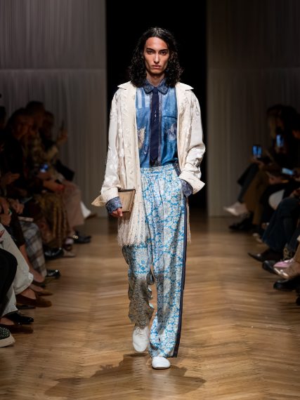 Capi in denim rivisitato, stampe foulard su capi in seta, abiti drappeggiati e lunghe frange sfilano alla Milano Fashion Week sulla passerella Primavera/Estate 2026 di Pierre-Louis Mascia,