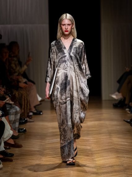 Capi in denim rivisitato, stampe foulard su capi in seta, abiti drappeggiati e lunghe frange sfilano alla Milano Fashion Week sulla passerella Primavera/Estate 2026 di Pierre-Louis Mascia,