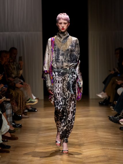 Capi in denim rivisitato, stampe foulard su capi in seta, abiti drappeggiati e lunghe frange sfilano alla Milano Fashion Week sulla passerella Primavera/Estate 2026 di Pierre-Louis Mascia,