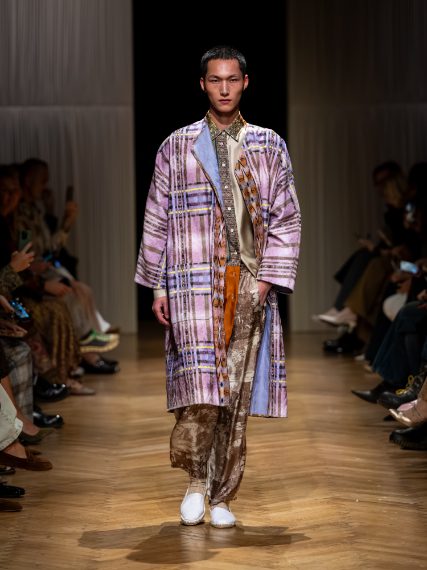 Capi in denim rivisitato, stampe foulard su capi in seta, abiti drappeggiati e lunghe frange sfilano alla Milano Fashion Week sulla passerella Primavera/Estate 2026 di Pierre-Louis Mascia,