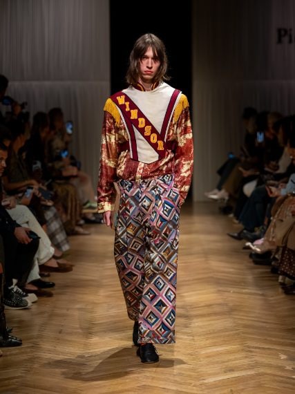 Capi in denim rivisitato, stampe foulard su capi in seta, abiti drappeggiati e lunghe frange sfilano alla Milano Fashion Week sulla passerella Primavera/Estate 2026 di Pierre-Louis Mascia,
