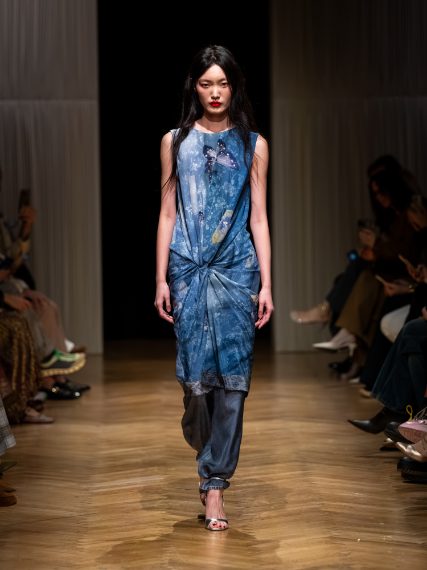 Capi in denim rivisitato, stampe foulard su capi in seta, abiti drappeggiati e lunghe frange sfilano alla Milano Fashion Week sulla passerella Primavera/Estate 2026 di Pierre-Louis Mascia,