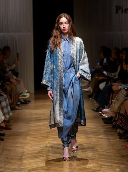 Capi in denim rivisitato, stampe foulard su capi in seta, abiti drappeggiati e lunghe frange sfilano alla Milano Fashion Week sulla passerella Primavera/Estate 2026 di Pierre-Louis Mascia,