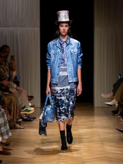 Capi in denim rivisitato, stampe foulard su capi in seta, abiti drappeggiati e lunghe frange sfilano alla Milano Fashion Week sulla passerella Primavera/Estate 2026 di Pierre-Louis Mascia,