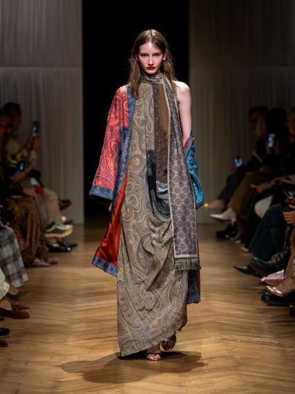 Capi in denim rivisitato, stampe foulard su capi in seta, abiti drappeggiati e lunghe frange sfilano alla Milano Fashion Week sulla passerella Primavera/Estate 2026 di Pierre-Louis Mascia,
