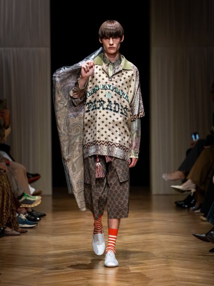 Capi in denim rivisitato, stampe foulard su capi in seta, abiti drappeggiati e lunghe frange sfilano alla Milano Fashion Week sulla passerella Primavera/Estate 2026 di Pierre-Louis Mascia,