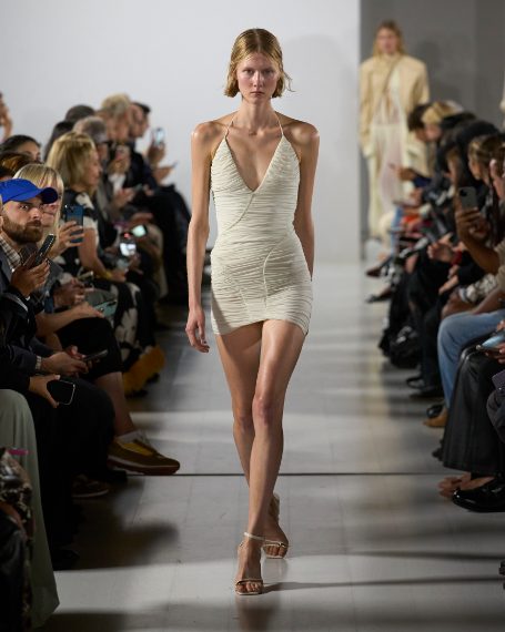 Morbidi drappeggi e abiti asimmetrici, candidi look color panna, suits oversize e completi in pelle sfilano alla Milano Fashion Week sulla passerella Primavera/Estate 2026 di Francesco Murano