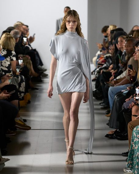 Morbidi drappeggi e abiti asimmetrici, candidi look color panna, suits oversize e completi in pelle sfilano alla Milano Fashion Week sulla passerella Primavera/Estate 2026 di Francesco Murano