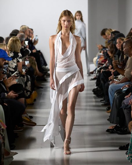 Morbidi drappeggi e abiti asimmetrici, candidi look color panna, suits oversize e completi in pelle sfilano alla Milano Fashion Week sulla passerella Primavera/Estate 2026 di Francesco Murano