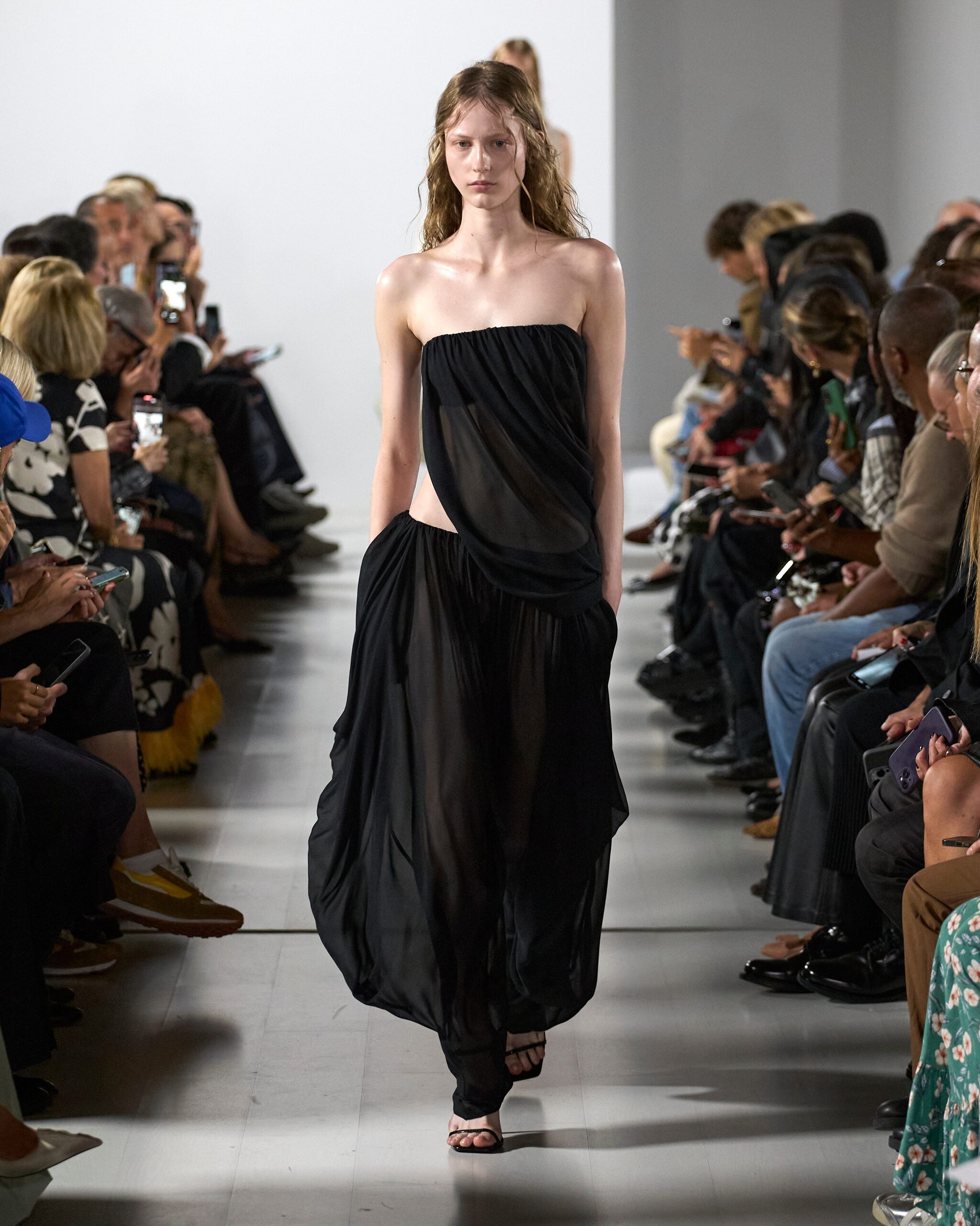 Morbidi drappeggi e abiti asimmetrici, candidi look color panna, suits oversize e completi in pelle sfilano alla Milano Fashion Week sulla passerella Primavera/Estate 2026 di Francesco Murano