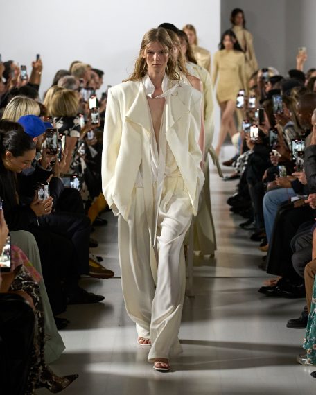 Morbidi drappeggi e abiti asimmetrici, candidi look color panna, suits oversize e completi in pelle sfilano alla Milano Fashion Week sulla passerella Primavera/Estate 2026 di Francesco Murano