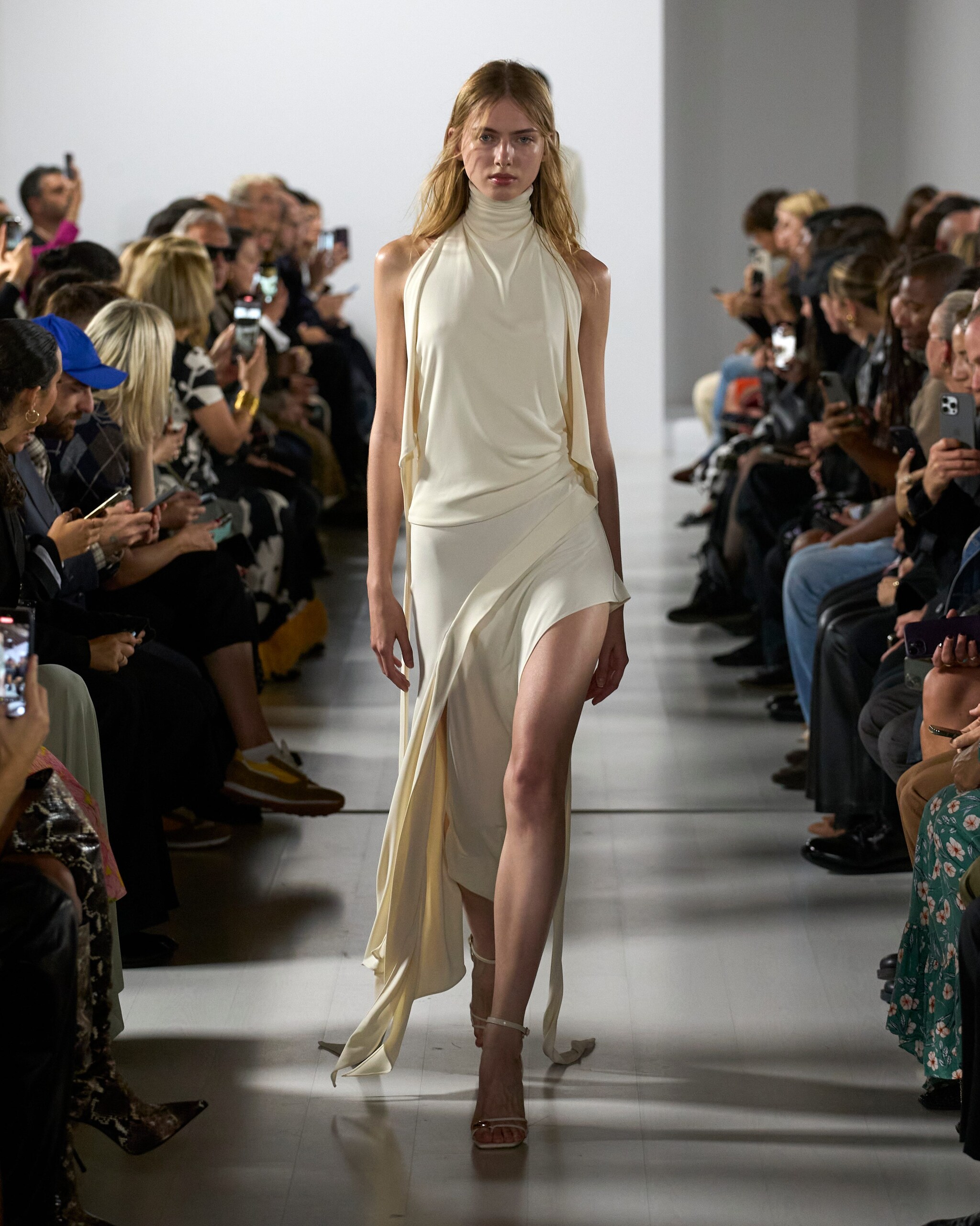 Morbidi drappeggi e abiti asimmetrici, candidi look color panna, suits oversize e completi in pelle sfilano alla Milano Fashion Week sulla passerella Primavera/Estate 2026 di Francesco Murano
