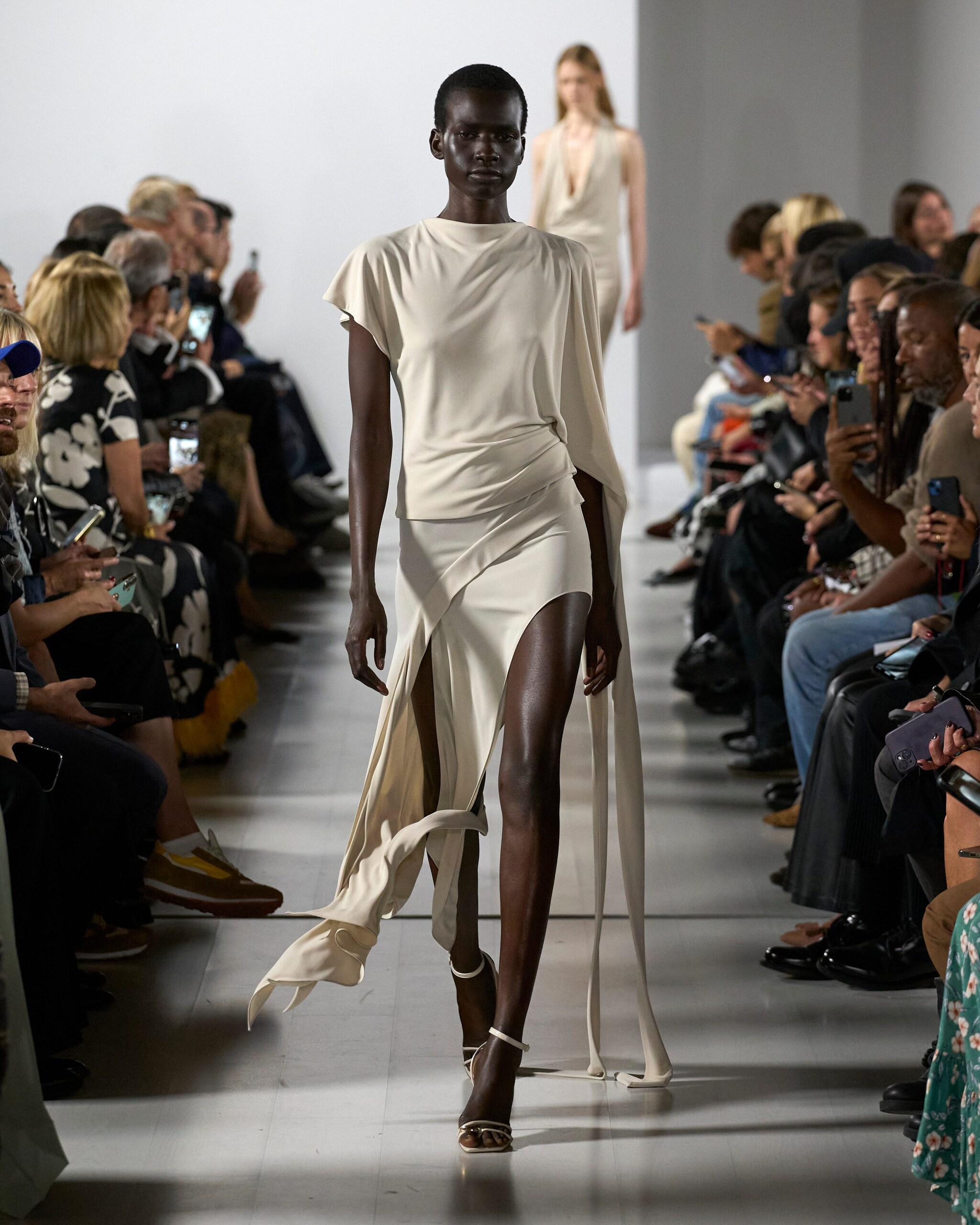Morbidi drappeggi e abiti asimmetrici, candidi look color panna, suits oversize e completi in pelle sfilano alla Milano Fashion Week sulla passerella Primavera/Estate 2026 di Francesco Murano