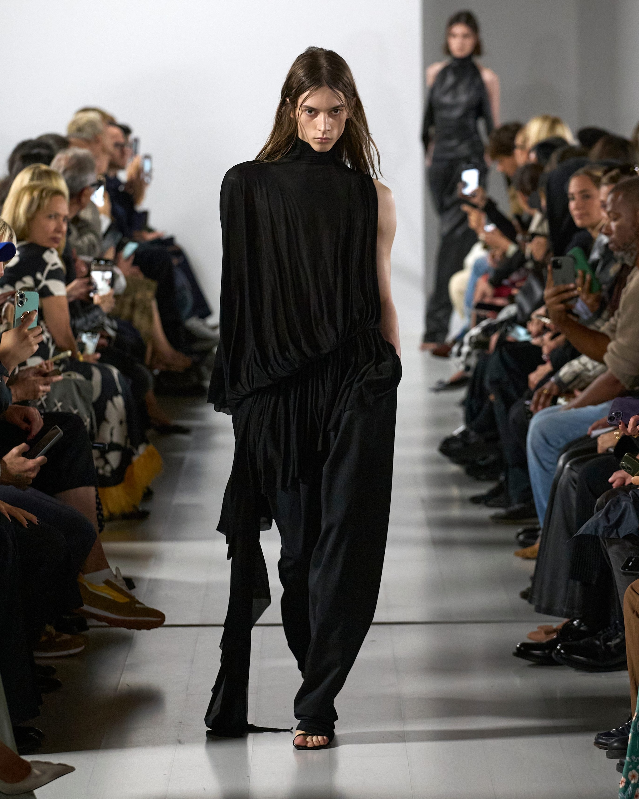 Morbidi drappeggi e abiti asimmetrici, candidi look color panna, suits oversize e completi in pelle sfilano alla Milano Fashion Week sulla passerella Primavera/Estate 2026 di Francesco Murano