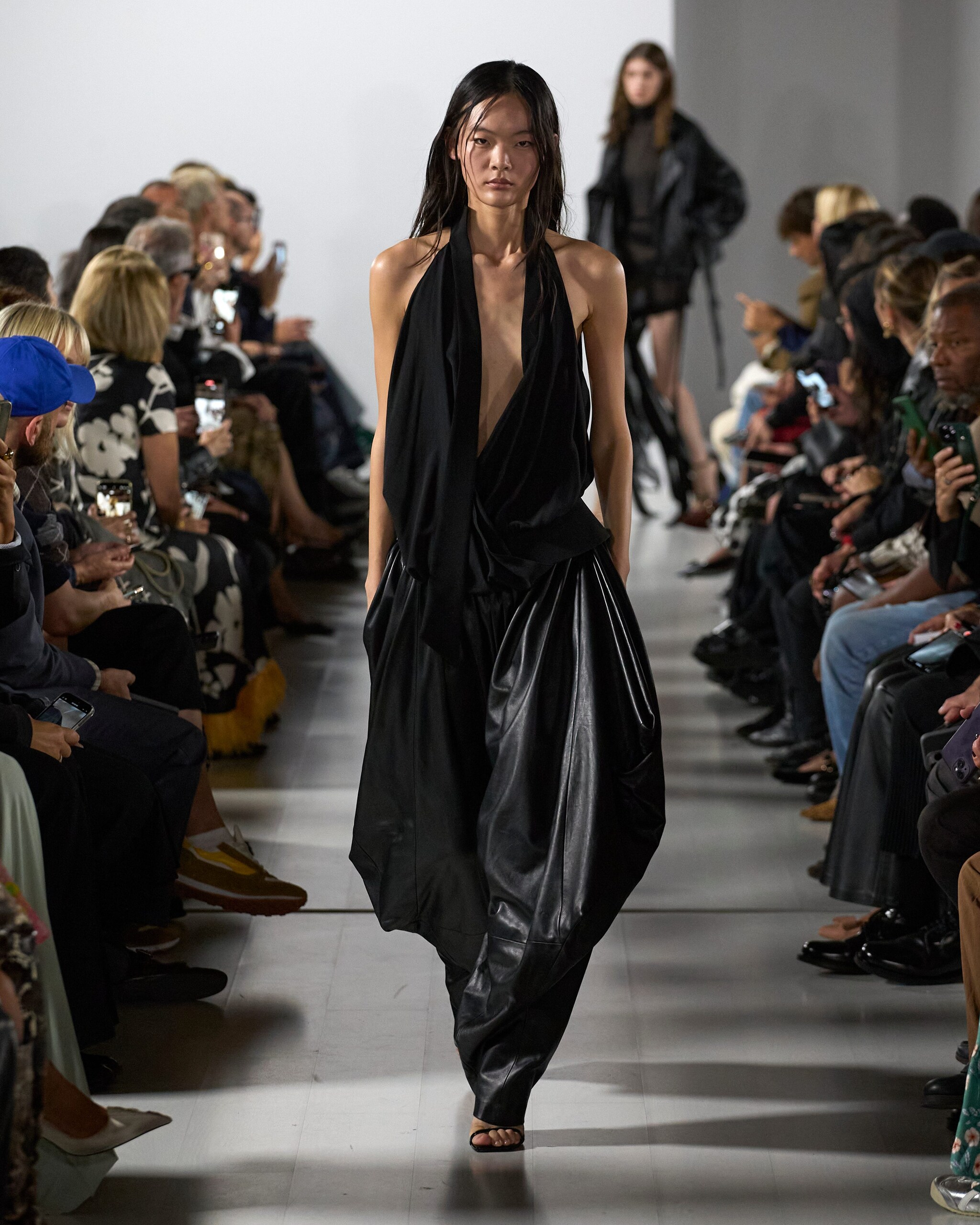 Morbidi drappeggi e abiti asimmetrici, candidi look color panna, suits oversize e completi in pelle sfilano alla Milano Fashion Week sulla passerella Primavera/Estate 2026 di Francesco Murano
