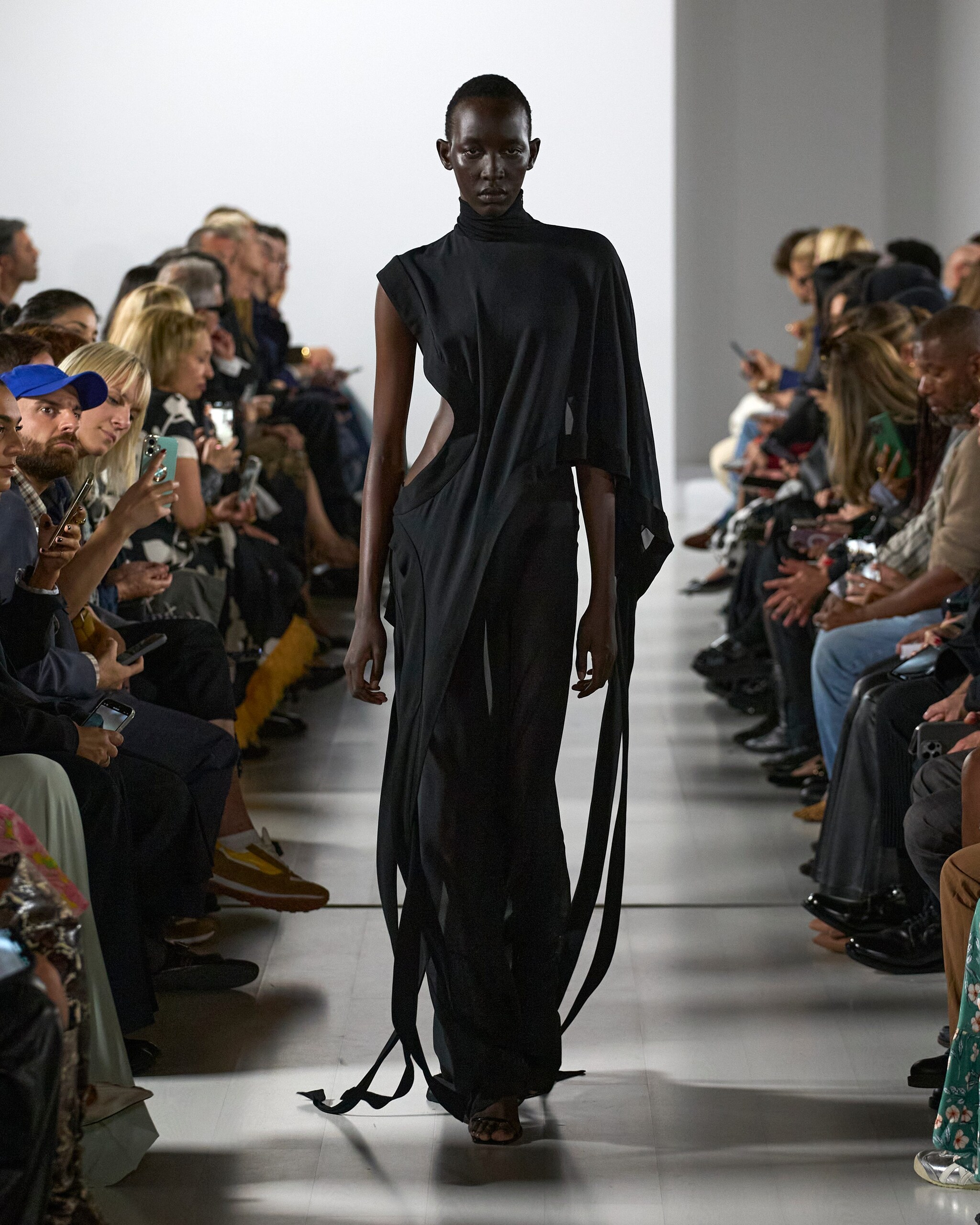 Morbidi drappeggi e abiti asimmetrici, candidi look color panna, suits oversize e completi in pelle sfilano alla Milano Fashion Week sulla passerella Primavera/Estate 2026 di Francesco Murano