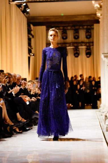 Completi oversize, abiti da sera coperti di cristalli, look in blu e completi in morbida seta sfilano alla Milano Fashion Week sulla passerella Primavera/Estate 2026 di Giorgio Armani