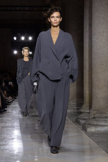 Completi oversize, abiti da sera coperti di cristalli, look in blu e completi in morbida seta sfilano alla Milano Fashion Week sulla passerella Primavera/Estate 2026 di Giorgio Armani