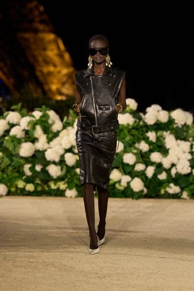 Completi con maxi chiodi e pencil skirt in pelle, camicie bianche con grossi fiocchi sul collo, abiti in tessuti tecnici e drammatici look da sera con volumetriche balze e ruche sfilano alla Paris Fashion Week sulla passerella Primavera/Estate 2026 di Saint Laurent