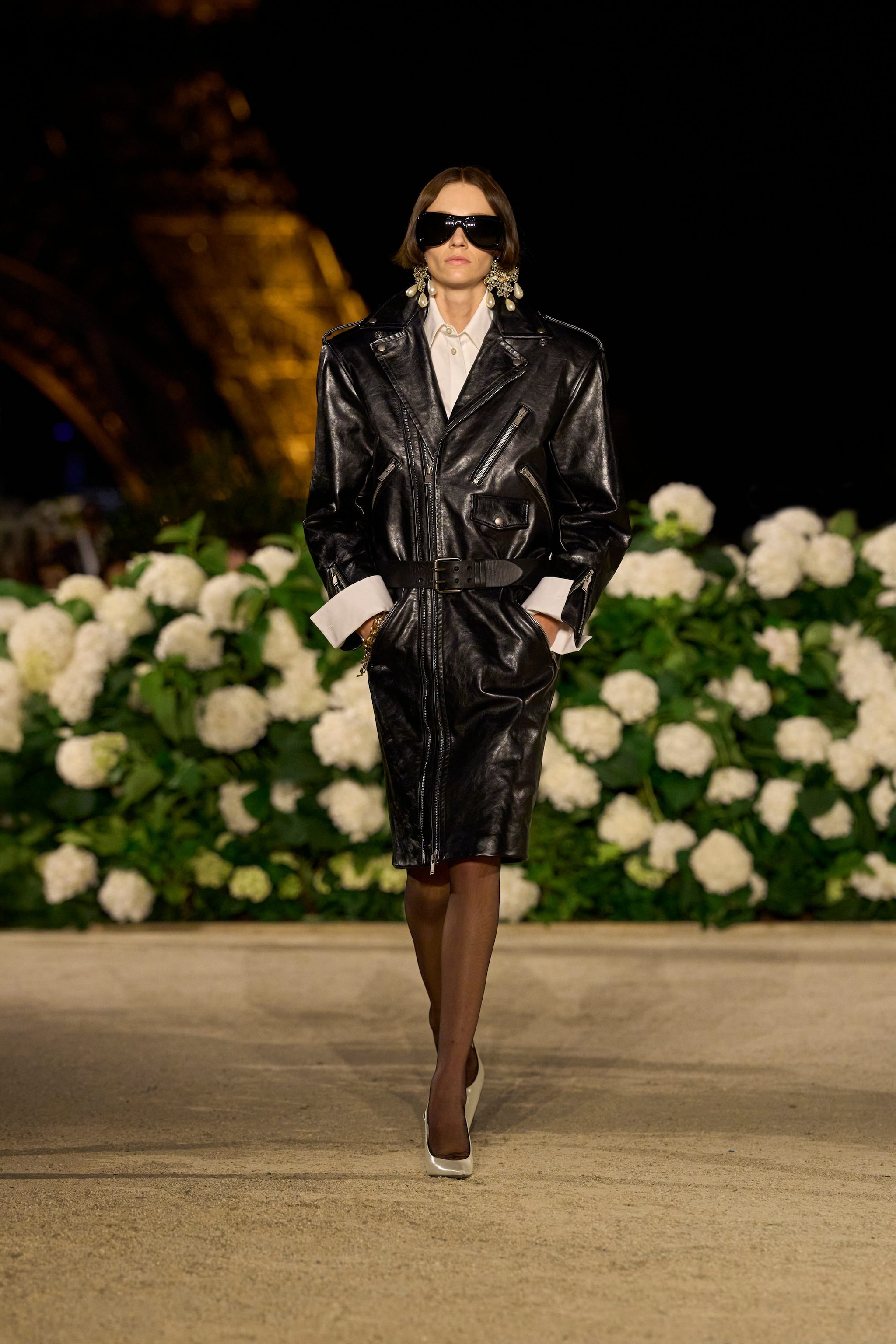Completi con maxi chiodi e pencil skirt in pelle, camicie bianche con grossi fiocchi sul collo, abiti in tessuti tecnici e drammatici look da sera con volumetriche balze e ruche sfilano alla Paris Fashion Week sulla passerella Primavera/Estate 2026 di Saint Laurent