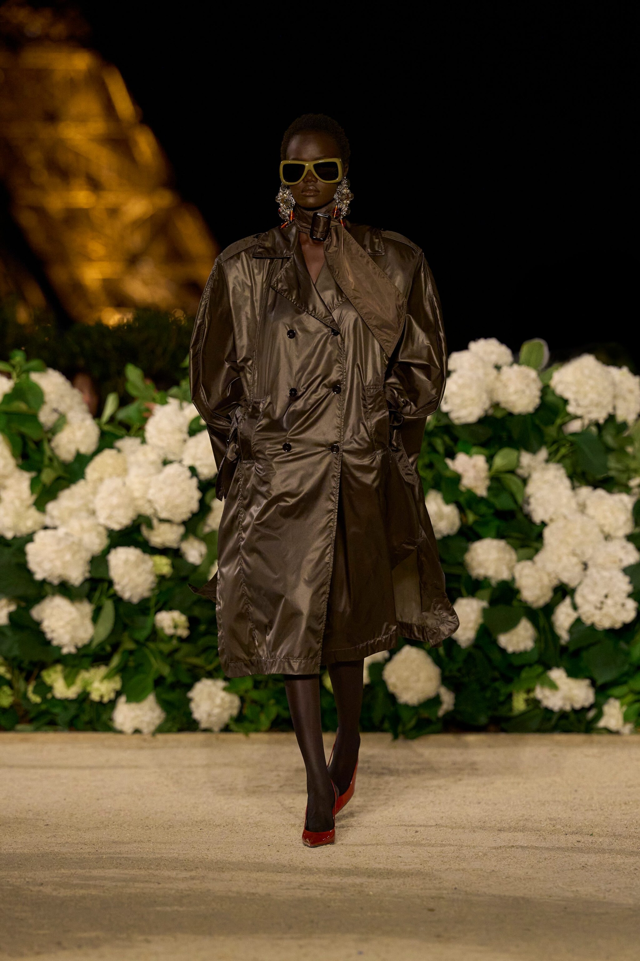 Completi con maxi chiodi e pencil skirt in pelle, camicie bianche con grossi fiocchi sul collo, abiti in tessuti tecnici e drammatici look da sera con volumetriche balze e ruche sfilano alla Paris Fashion Week sulla passerella Primavera/Estate 2026 di Saint Laurent