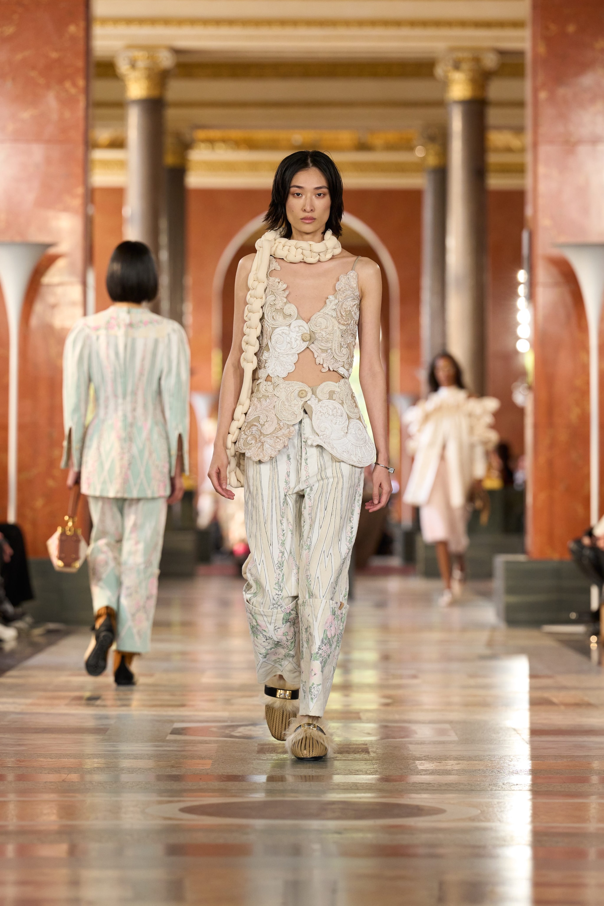 Completi coperti di frange, colletti in saint lunghissimi e spigolosi, casacche cadenti dai drappeggi extra large, sfilano alla Paris Fashion Week sulla passerella Primavera/Estate 2026 di Louis Vuitton.