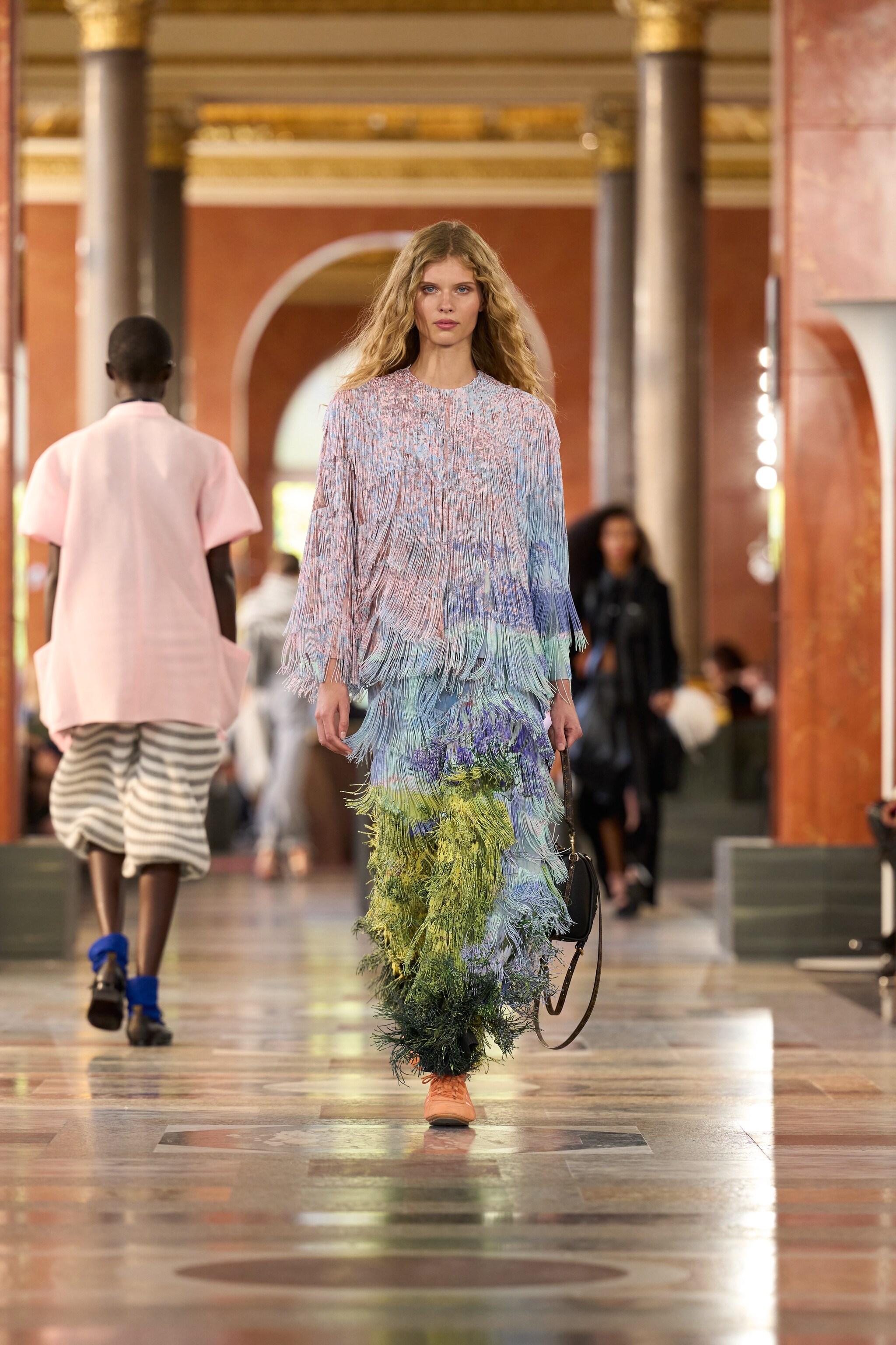 Completi coperti di frange, colletti in saint lunghissimi e spigolosi, casacche cadenti dai drappeggi extra large, sfilano alla Paris Fashion Week sulla passerella Primavera/Estate 2026 di Louis Vuitton.