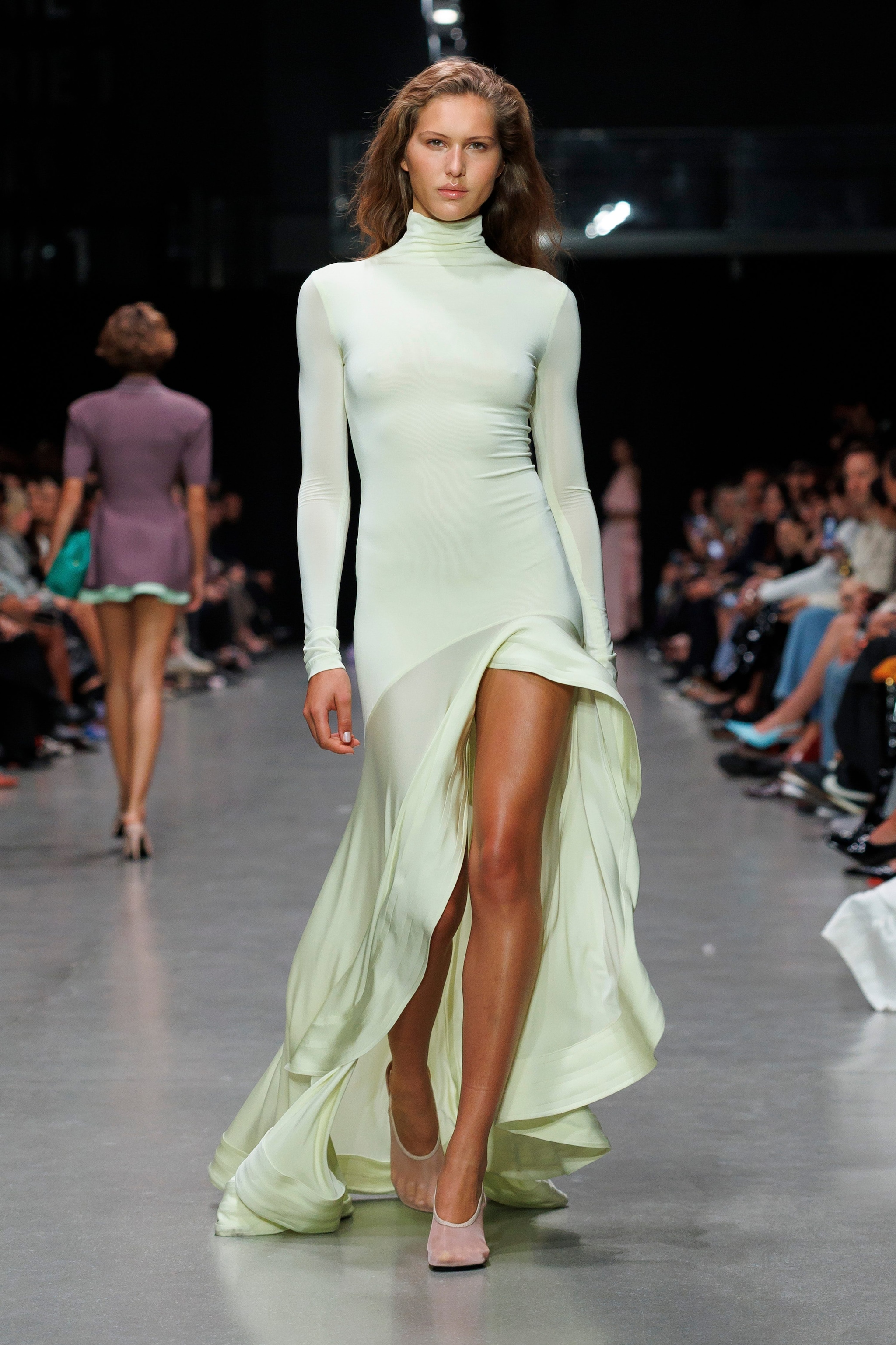Abiti polo, tubini aderenti, completi con blazer dalle spalle strutturate, stampe floreali e paillettes dai colori nude sfilano alla Paris Fashion Week sulla passerella Primavera/Estate 2026 di Stella McCartney