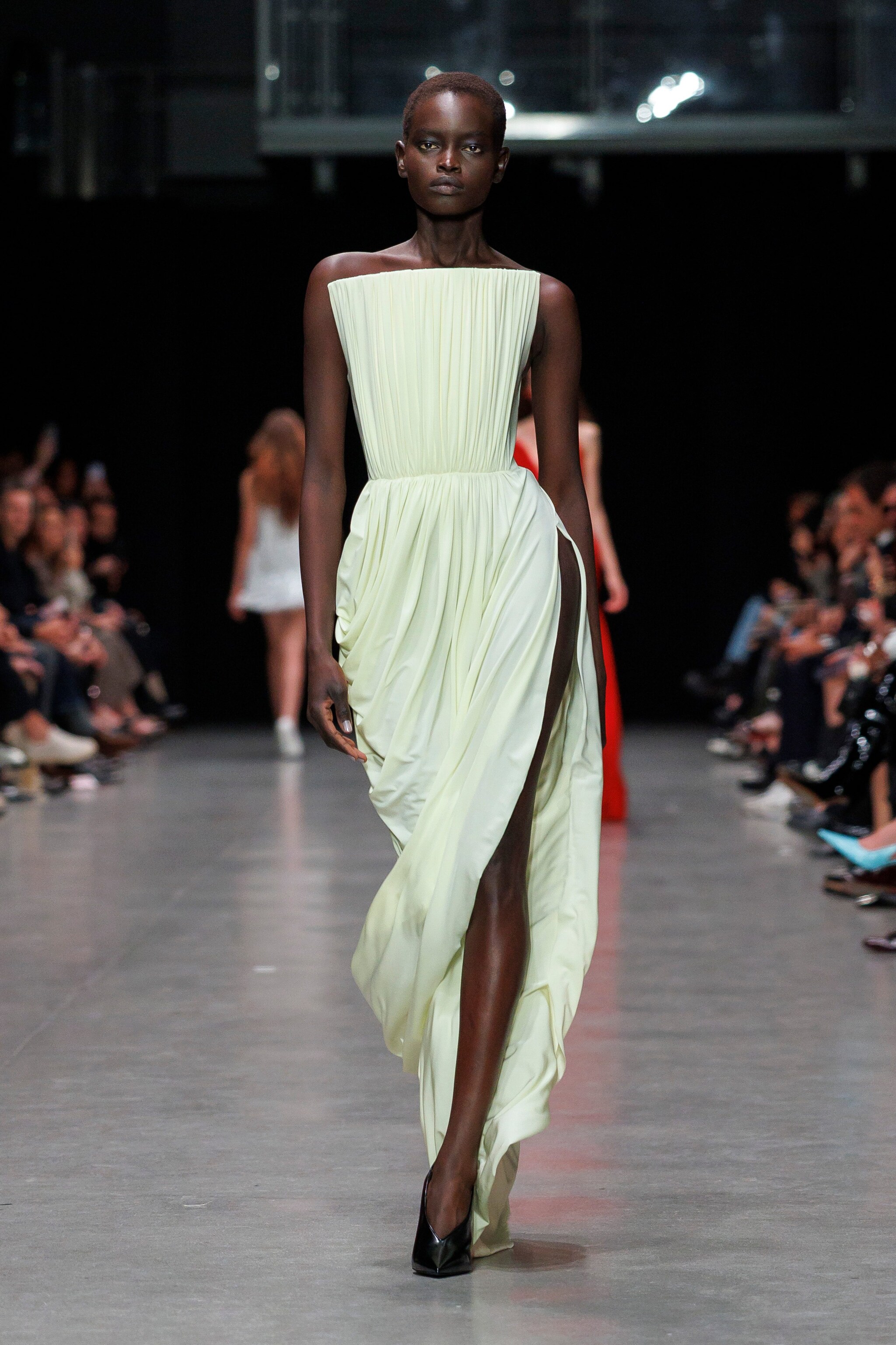 Abiti polo, tubini aderenti, completi con blazer dalle spalle strutturate, stampe floreali e paillettes dai colori nude sfilano alla Paris Fashion Week sulla passerella Primavera/Estate 2026 di Stella McCartney