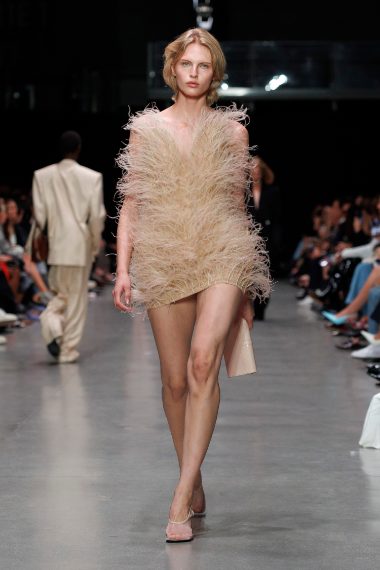 Abiti polo, tubini aderenti, completi con blazer dalle spalle strutturate, stampe floreali e paillettes dai colori nude sfilano alla Paris Fashion Week sulla passerella Primavera/Estate 2026 di Stella McCartney