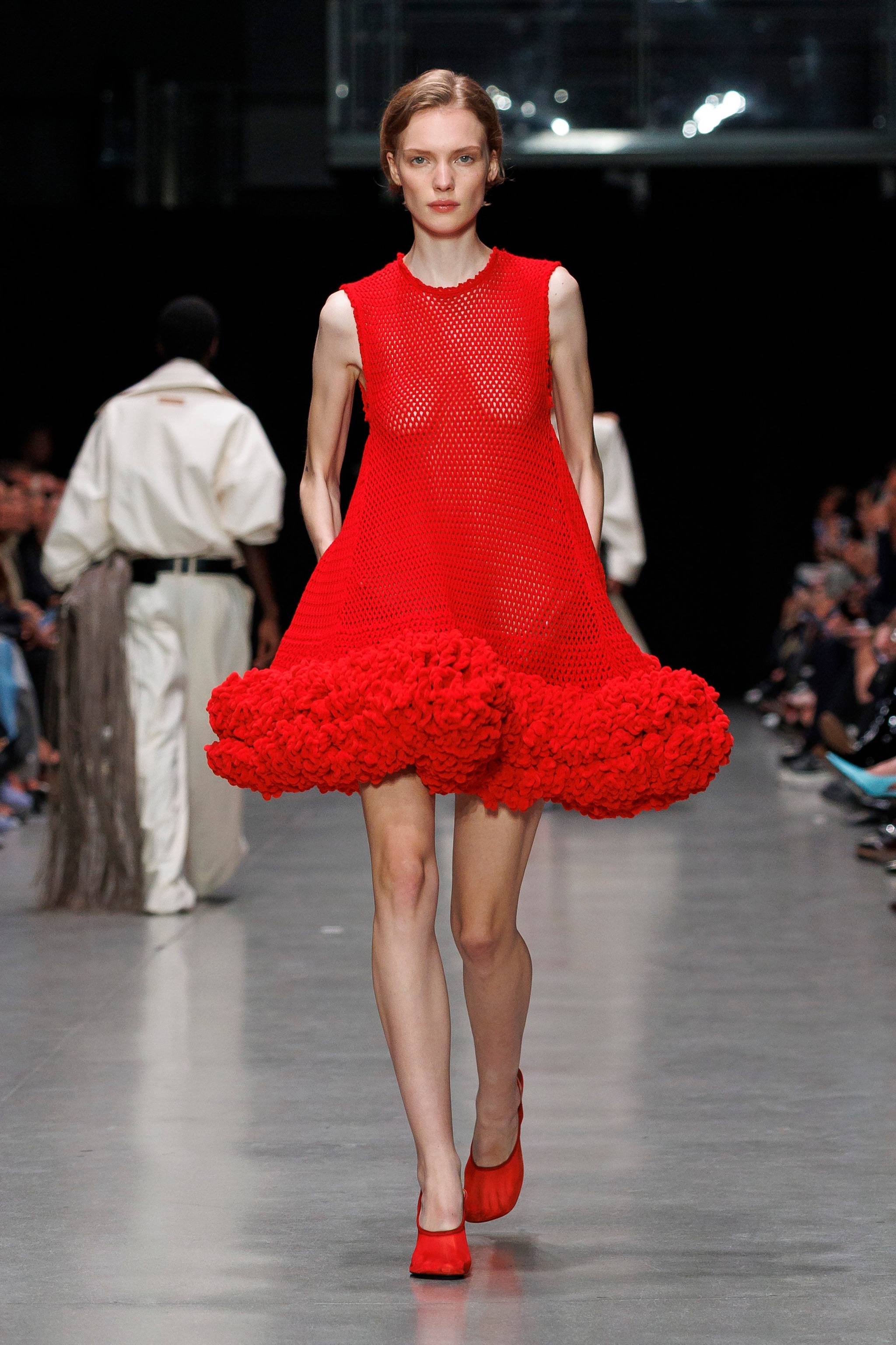 Abiti polo, tubini aderenti, completi con blazer dalle spalle strutturate, stampe floreali e paillettes dai colori nude sfilano alla Paris Fashion Week sulla passerella Primavera/Estate 2026 di Stella McCartney