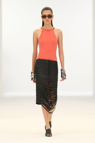 Sprazzi di azzurro e turchese e look blu navy o total black, inserti velati che coprono il volto e linee geometriche e rigorose sfilano alla Paris Fashion Week sulla passerella Primavera/Estate 2026 di Courreges