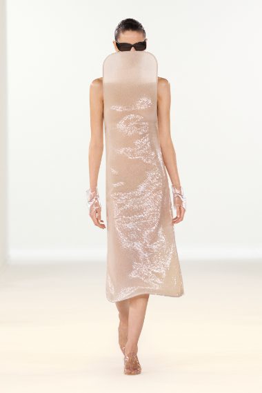 Sprazzi di azzurro e turchese e look blu navy o total black, inserti velati che coprono il volto e linee geometriche e rigorose sfilano alla Paris Fashion Week sulla passerella Primavera/Estate 2026 di Courreges