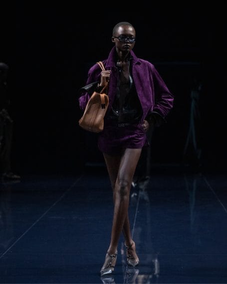 Giacche in suede e completi in pelle colorata, sensuali abiti tunica che aderiscono al corpo senza scoprirlo, slipress e capi in seta e pizzo che ricordano capi intimo o nightwear e ancora sgargianti tocchi di colore acceso sfilano alla Paris Fashion Week sulla passerella Primavera/Estate 2026 di Tom Ford by Haider Hackerman