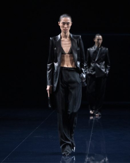 Giacche in suede e completi in pelle colorata, sensuali abiti tunica che aderiscono al corpo senza scoprirlo, slipress e capi in seta e pizzo che ricordano capi intimo o nightwear e ancora sgargianti tocchi di colore acceso sfilano alla Paris Fashion Week sulla passerella Primavera/Estate 2026 di Tom Ford by Haider Hackerman